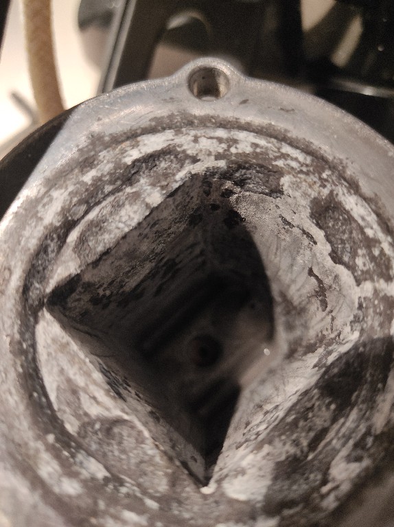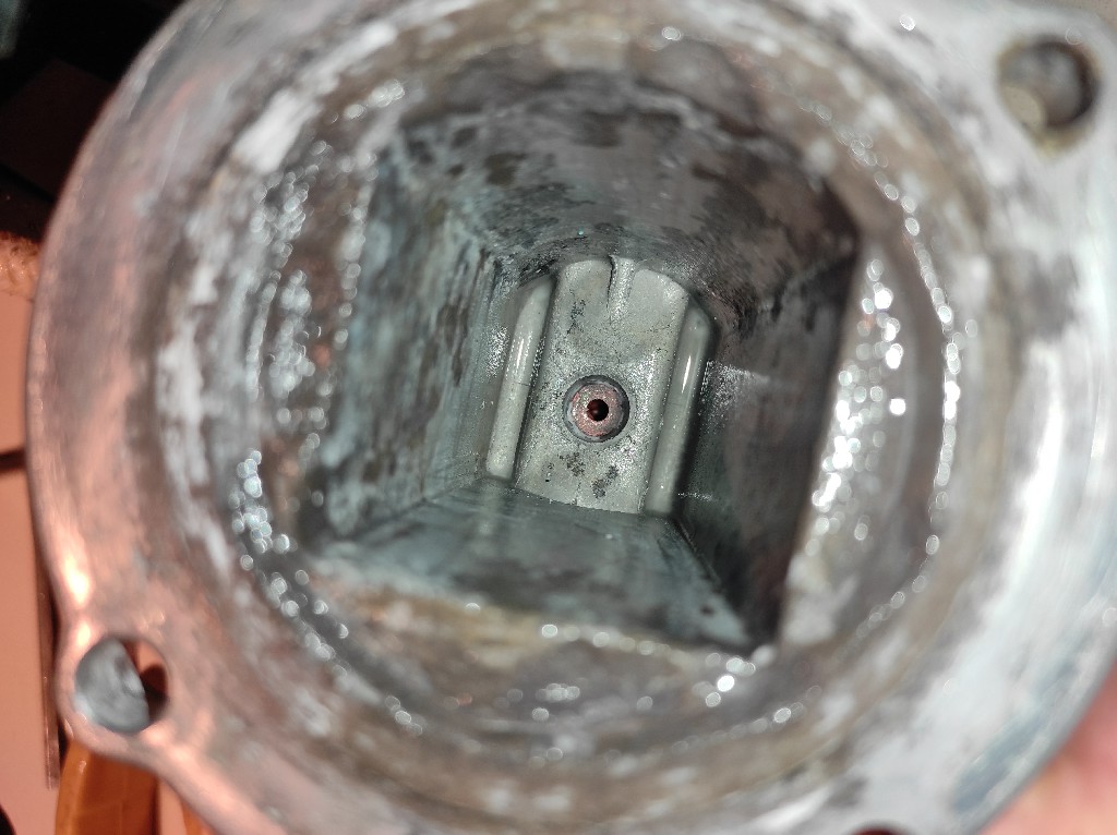 ΈΛυσα την καφετιέρα και το boiler και με έκπληξη διαπίστωσα έντονα συσωρευμένα άλατα στο κάτω μέρος του και περιμετρικά διάβρωση του αλουμινένιου Boiler απο το οποίο ξεκόλλησαν 2 κομμάτια και τα φλούδια του έπιασαν πάτο και έπεφταν μέσα στις τρύπες.