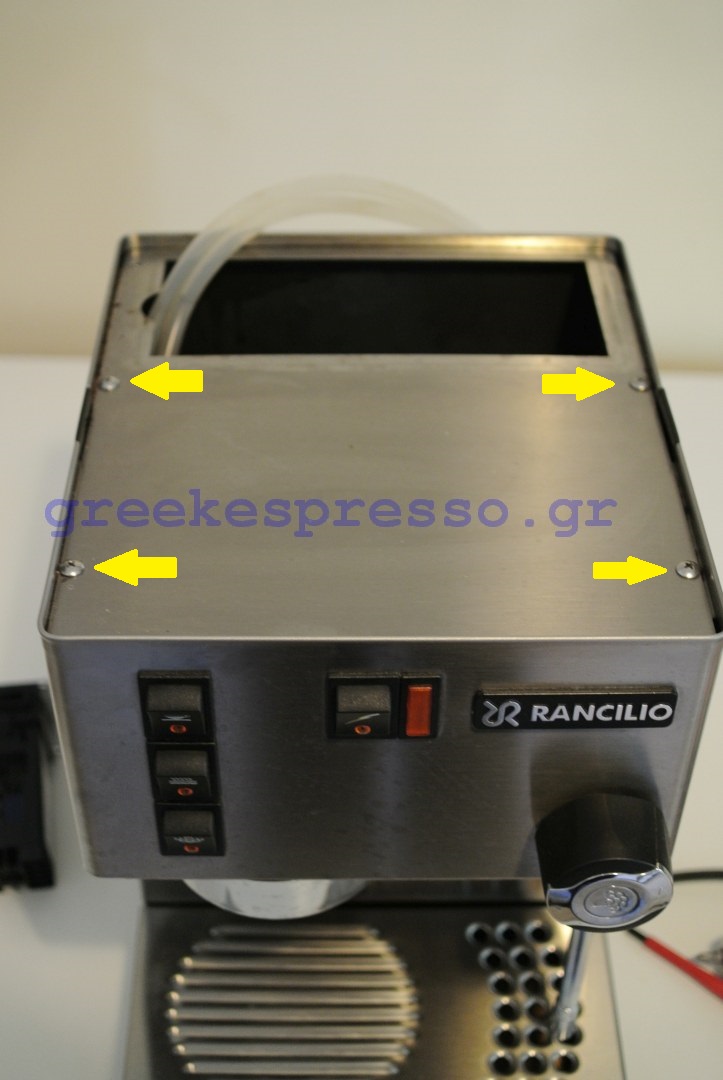 Πρώτα απ΄όλα αποσυνδέουμε την μηχανή από το ηλεκτρικό ρεύμα. Αφού βγάλουμε από την μηχανή το δοχείο νερού και τον δίσκο για τα απόνερα, ξεβιδώνουμε τις 4 βίδες που δείχνουν τα κίτρινα βέλη.