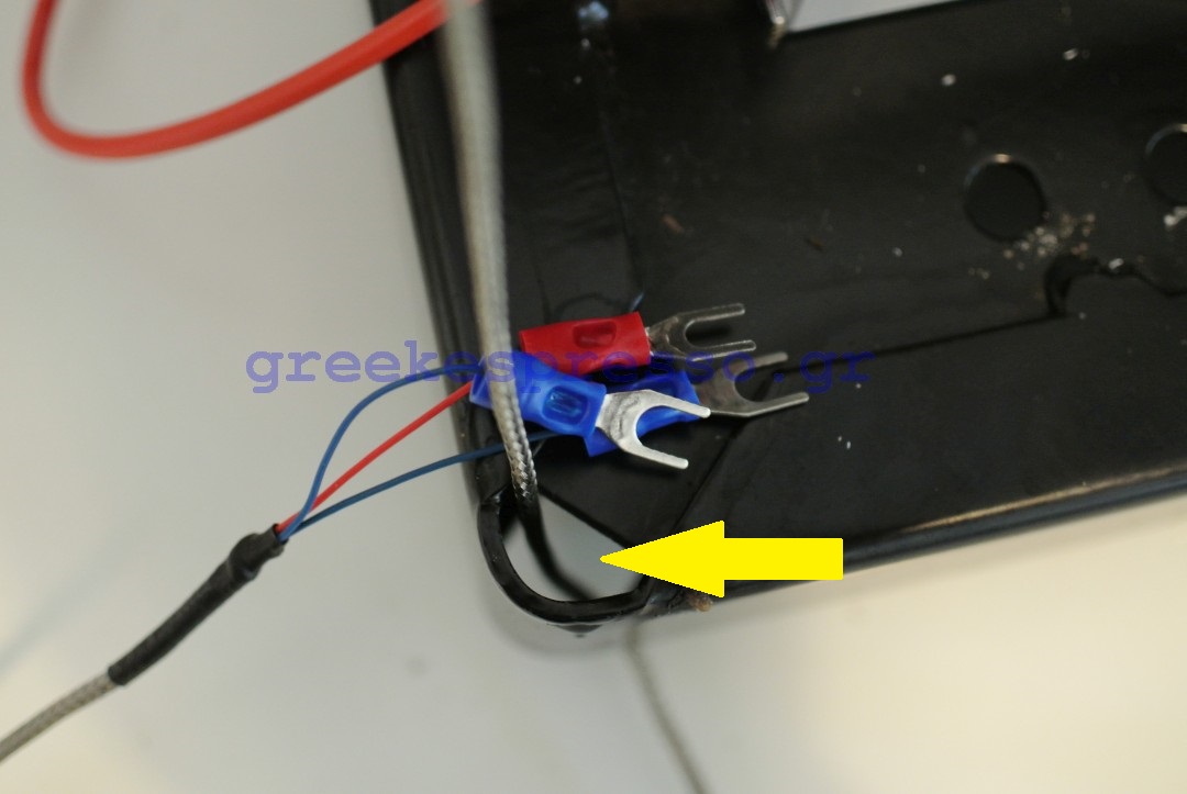 Το άλλο άκρο του αισθητήρα με τους δύο μπλέ και έναν κόκκινο ακροδέκτες τους περνάμε από την γωνιακή τρύπα που υπάρχει στην βάση της μηχανής και από εκεί τους συνδέουμε με το PID αφού το περάσουμε και από την τρύπα της αλουμινένιας θήκης πρώτα.