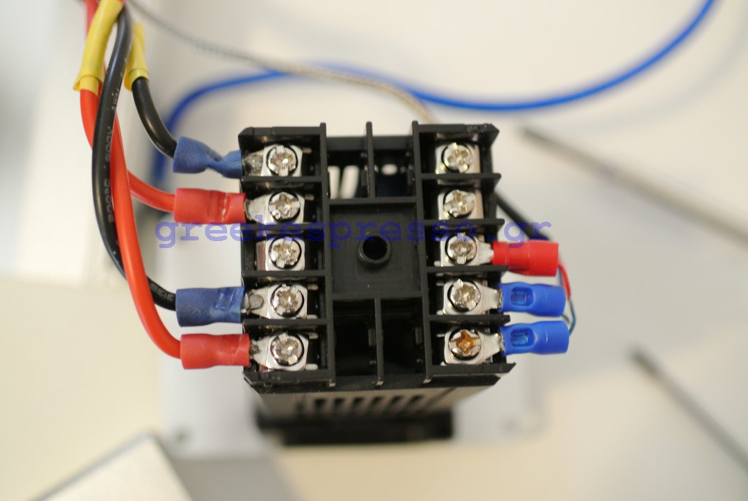 Εδώ βλέπουμε το κόκκινο καλώδιο ρεύματος τροφοδοσίας, που ξεκινάει από τον κεντρικό διακόπτη της μηχανής, να συνδέεται στο PID στην θέση 2 (ελέγξτε πάντα το σχεδιάγραμμα συνδέσεων του controller για πιθανή διαφοροποίηση των θέσεων σύνδεσης). Ομοίως το μαύρο καλώδιο συνδέεται στην θέση 1 (δεν φαίνεται στην φωτογραφία). Να σημειωθεί επίσης η σύνδεση του Pt100 αισθητήρα στην φωτογραφία 22 είναι λάθος.