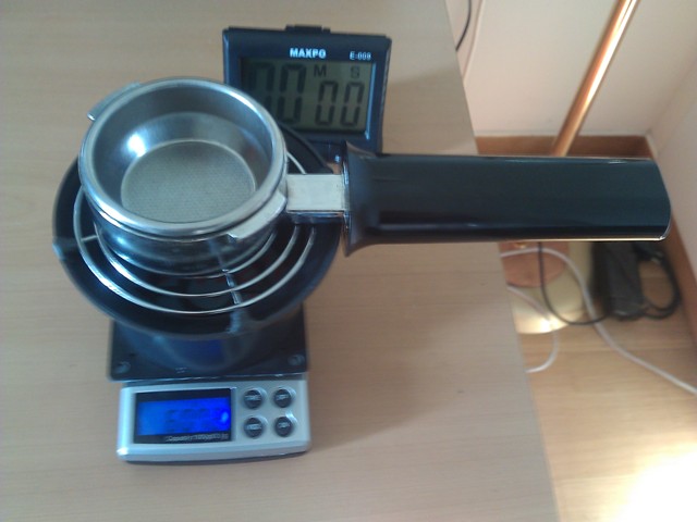 Ζυγίζω το καφέ μαζί με το pf τις τελευταίες 10 μέρες και βρίσκω λίγο άβολο να χρειαστεί να αφαιρέσω καφέ από το καλαθάκι, στη περίπτωση που πέσει πέρα από το επιθυμητό. Παρατηρώ ότι 0,5 γραμμάριο καφέ μπορεί να δώσει έως και +5"" στην εκχύλιση, οπότε η ακριβής μέτρηση είναι απαραίτητη.