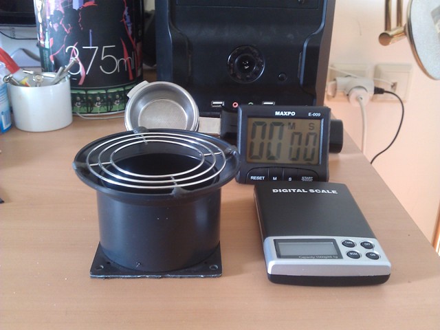 Και αφου παρελαβα και εγω την ζυγαρια μου και το χρονομετρο απο το ebay και ορμομενος απο την ιδεα με τη βαση του φιλου focus, να παρουσιασω και εγω τη βαση που εφτιαξα για να ζυγιζω τον καφε μαζι με το pf.Για υλικα χρησιμοποιησα ενα εξαερισμο ανεμιστηρα απο pc-case και μια προστατευτικη σητα για ανεμιστηρακι και λιγη εποξικη πλαστελινη για σταθεροποιηση της σητας.Αφου αφαιρεσα τους τρεις μικροτερους κυκλους της σητας ωστε να μπαινει μεσα το spout (ειτε μονο ειτε διπλο χωραει ανετα) με λιγη εποξικη πλαστελινη στερεωθηκε στον εξαερισμο και εκει πλεον καθεται ανετα και σταθερα το pf μας και ζυγιζουμε τον καφε μας μια χαρα!Κυριε αντμιν αν νομιζετε οτι πρεπει να μεταφερθει αλλου το θεμα μου πραξτε τα δεοντα.Σκοπος μου ειναι να δωσω ιδεες οπως πηρα και εγω απο τον φιλο focus.