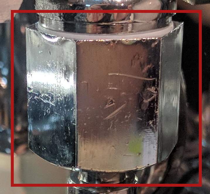 Η μηχανή είναι "ντυμένη" με προστατευτικά αυτοκόλλητα. Βγάζοντάς τα και περιεργαζόμενος τη μηχανή, φαίνεται εύκολα ότι η ποιότητα κατασκευής είναι όντως μέτρια και ο έλεγχος πριν αποσταλεί πλημμελής. Σε διάφορα σημεία της μηχανής η "χρωμίωση" απέχει από το τέλειο και υπάρχουν μικρογρατζουνιές - γδαρσίματα. Χαρακτηριστικά σας δείχνω σε φωτό τη "βίδα" στη "βρύση" του ζεστού νερού.