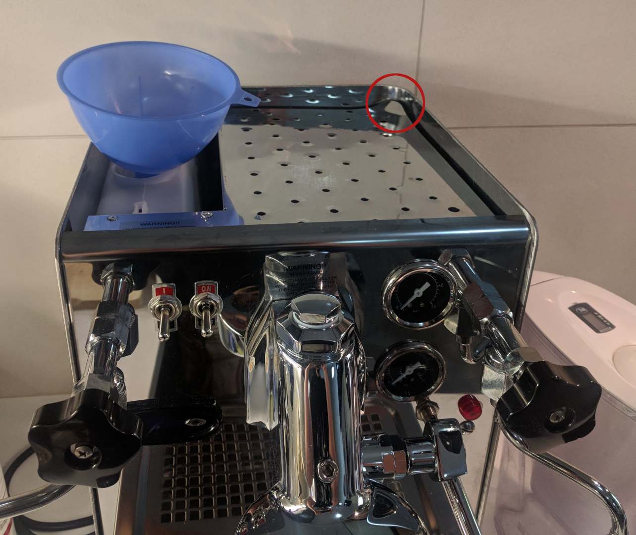 Η λαμαρίνα που καλύπτει από επάνω τα σωθικά της μηχανής είναι αρκετά στραβωμένη στη μία γωνία της. Ευτυχώς όμως όχι αρκετά που να εμποδίζει το κάλυμα (πάνω στο οποίο κάθονται τα ποτήρια κτλ) να κάτσει σωστά.