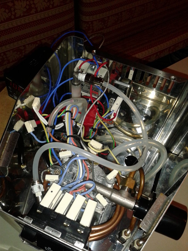 Σχετικά με την επαφή με το boiler: μπροστά το boiler της Gaggia είναι ισιό. Εκεί πρέπει να βρείτε κάποιο αντικείμενο που να χωράει και να γεμίζει αυτόν τον χώρο. Εγώ έβαλα ένα πολύ μικρό αλουμινένιο filter από μια παλιά εσπρεσσιέρα. Στα σημεία που ακουμπάει ο σωλήνας με το boiler καλό θα ήταν να μπει λίγη παστούλα CPU για ακόμη καλύτερη μεταφορά θερμότητας. Ιδιαίτερη βάση να δωθεί στο πλάι του boiler όπως κοιτάμε την μηχανή από μπροστά, όπου και είναι τοποθετημένα τα θερμοστοιχεία.