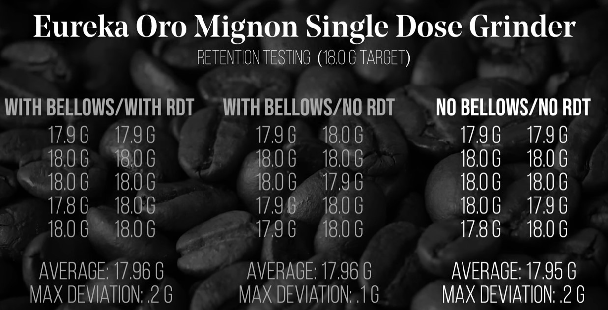 Αρχίζοντας με το θέμα της κατακράτησης με καθαρό μύλο έκανα 3 δοκιμές , μία την πρώτη φορά και άλλες 2 τον άνοιξα τον καθάρισα με πινέλο και η κατακράτησή του ήταν από 1,6-1,8 grams. Από εκεί και πέρα σχεδόν ότι βάζεις παίρνεις . Σε όσες δοκιμές έκανα το bellow δεν μου έδωσε τίποτα παραπάνω σε γραμμάρια. Οι μετρήσεις μου είναι σχεδον ίδιες με του Whole Latte Love οπότε παραθέτω παράκατω το πινακάκι με τις μετρήσεις και το video review.