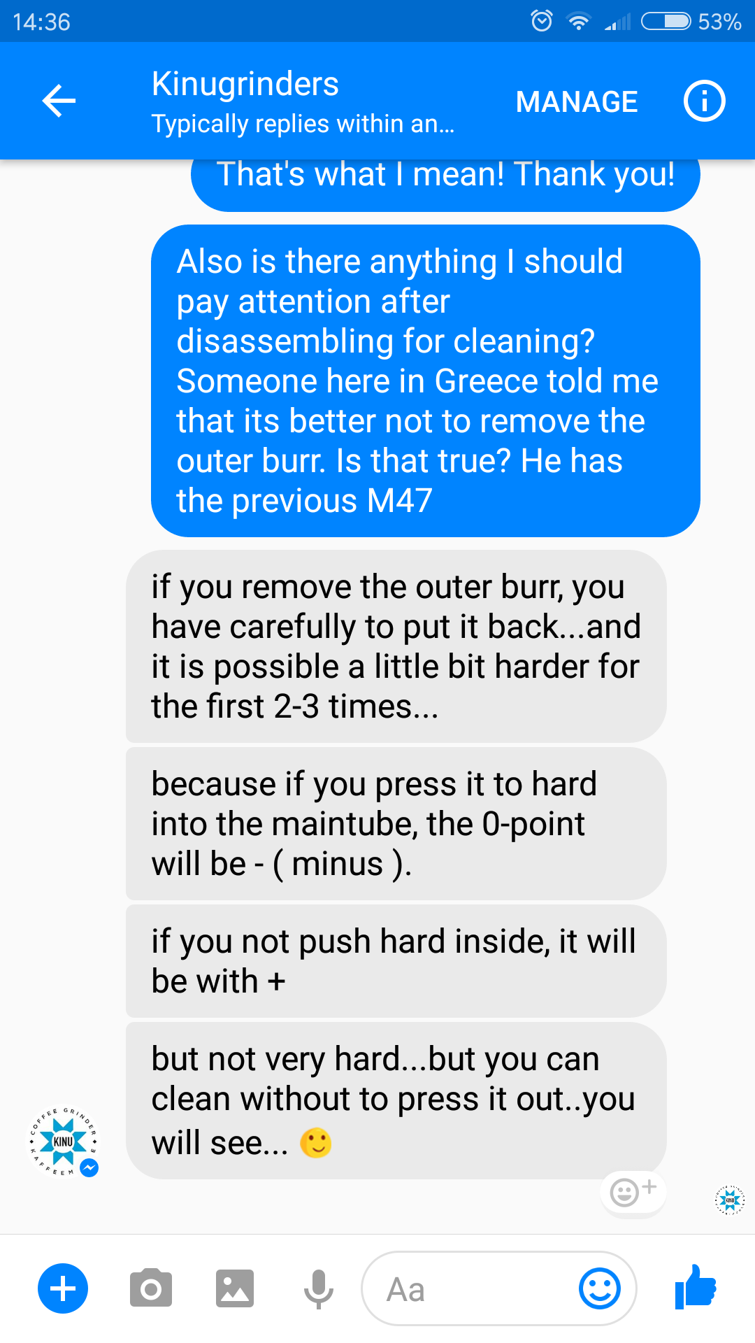 Συμφωνώ απόλυτα με το πως το θέτει. Δε χρειάζεται να βγει το εξωτερικό μαχαίρι κατά τον καθαρισμό. Απλά στα σχετικά βιντεακια του YouTube το κάνει να δείχνει πολύ εύκολο χωρίς να τονίζεται πως 90% μετά θα έχεις ζήτημα με το σημείο 0. Για μένα που κάνω φίλτρου η ακρίβεια δεν είναι μείζον ζήτημα αλλά για εσπρέσο λογικά θα μετράει.